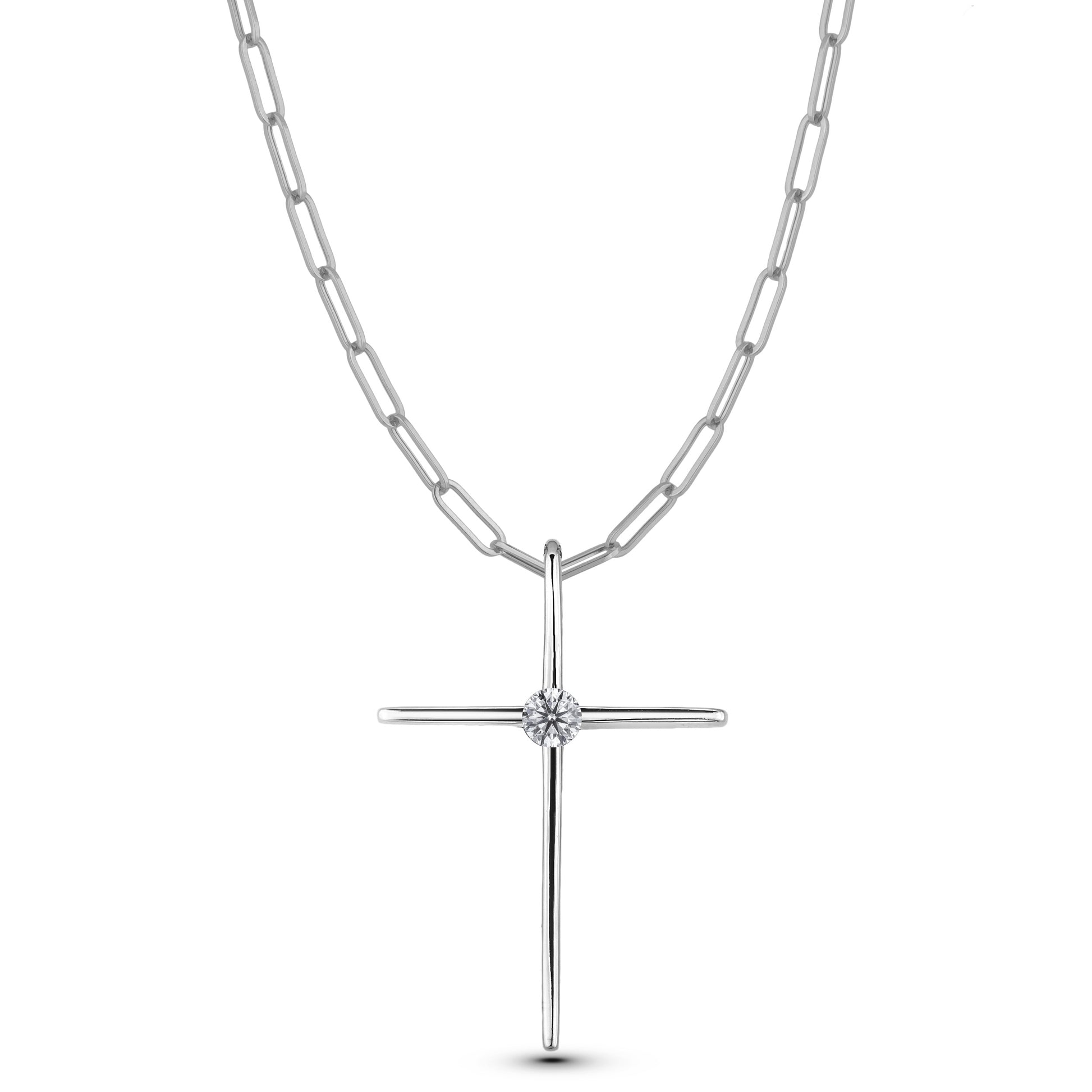 925 Sterling Silver 0.12 Ct Natural Canadian Diamond Solitaire Thin Cross Pendant & Paperclip Chain